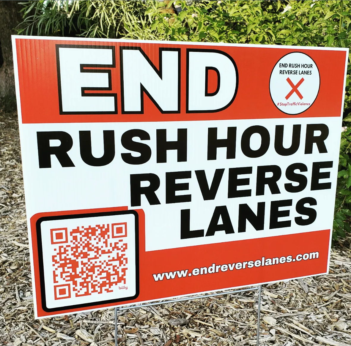 Yard sign for signing petition to end the reverse lanes. Photo by Nicole Rodriguez